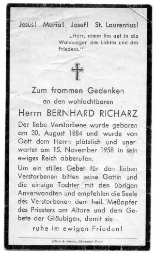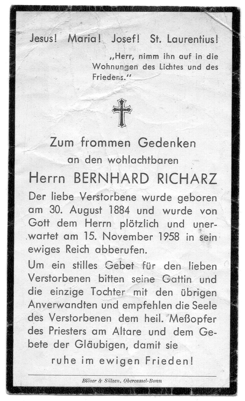 Der Sohn von Johann Richarz *21.12.1848, Bernhard Richarz *1884 oo 23.07.1909Köln, Jeannette geb. Manderfelt *1887 aus Köln, war um 1950 im Besitz des Hauses. Er war Betriebsmeister vor/nach 1.Weltkrieg in Tongrube Oberdollendorfer Hard. Die Totenkarte ist ein Geschenk von Ernst Emil Müsgen 4.Foto. Auch wusste Pauline Köder (Tochter von Peter Josef Schmitz ) über Bernhard Bescheid.