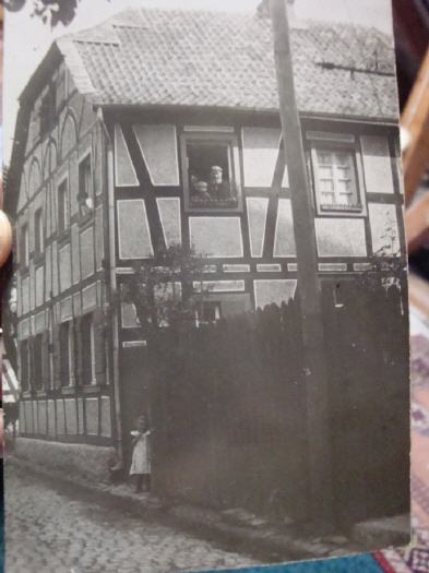 oben Fenster zur Strasse ist Jeannette Richarz geb .Manderfeld, daneben Johann Richarz I *1848 mit dem Enkelkind Johann *1909 unten Hoftür Enkelkind Helena Richarz *1910